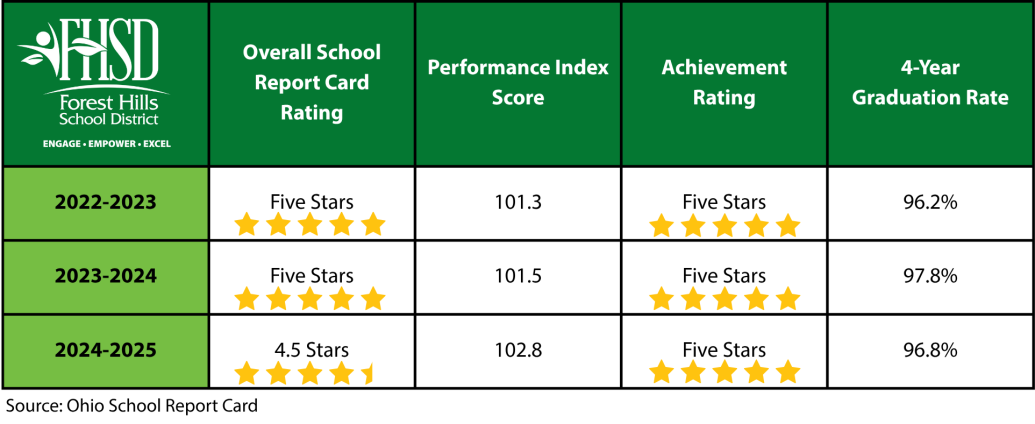 While accomplishments, accolades, test scores and other available data cannot, on their own, show how successful FHSD is at producing individuals who possess the knowledge, skills and personal qualities necessary to excel after graduation and become responsible citizens, this information can be helpful when used to evaluate our work in specific areas of the FHSD Strategic Plan. You can view the strategic plan document to see which data are used in relation to the different priorities and action statements. The information shared below is simply an attempt to provide an overview of a few key areas and is not meant to be a full description of all strategic plan metrics. The district regularly monitors key information throughout the school year, and some figures will be updated as new data becomes available. Ohio School Report Card data is released once per year by the Ohio Department of Education and Workforce.